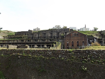 [13:50] [残り3時間40分|両津行きあと1時間28分] 手前側の芝生部分が仕上工場跡、奥の赤いラインの入ったキューポラが立っている廃墟が鋳造工場跡。 |